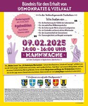 Herzliche Einladung zur Mahnwache des „Bündnis für den Erhalt von Demokratie & Vielfalt“ am 09. Februar von 14:00 bis 16:00 Uhr am Stadtplatz in Deidesheim.